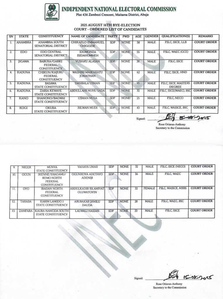The Independent National Electoral Commission (INEC) says it has complied with a Federal High Court ruling ordering the inclusion of the Social Democratic Party (SDP) and its candidates in bye-elections taking place in 12 states tomorrow, Saturday, August 16, 2025.