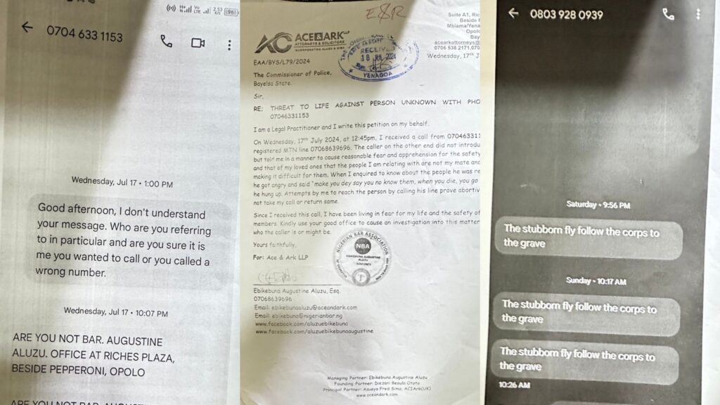 However, the threats escalated. On Wednesday, July 17, 2025, the unidentified person appeared to confirm Aluzu’s identity and whereabouts, saying: “ARE YOU NOT BAR OFFICE AT RICHES PLAZA, BESIDE PEPPERONI, OPOLO?” — an apparent reference to the lawyer’s office location in Yenagoa, the Bayelsa State capital.